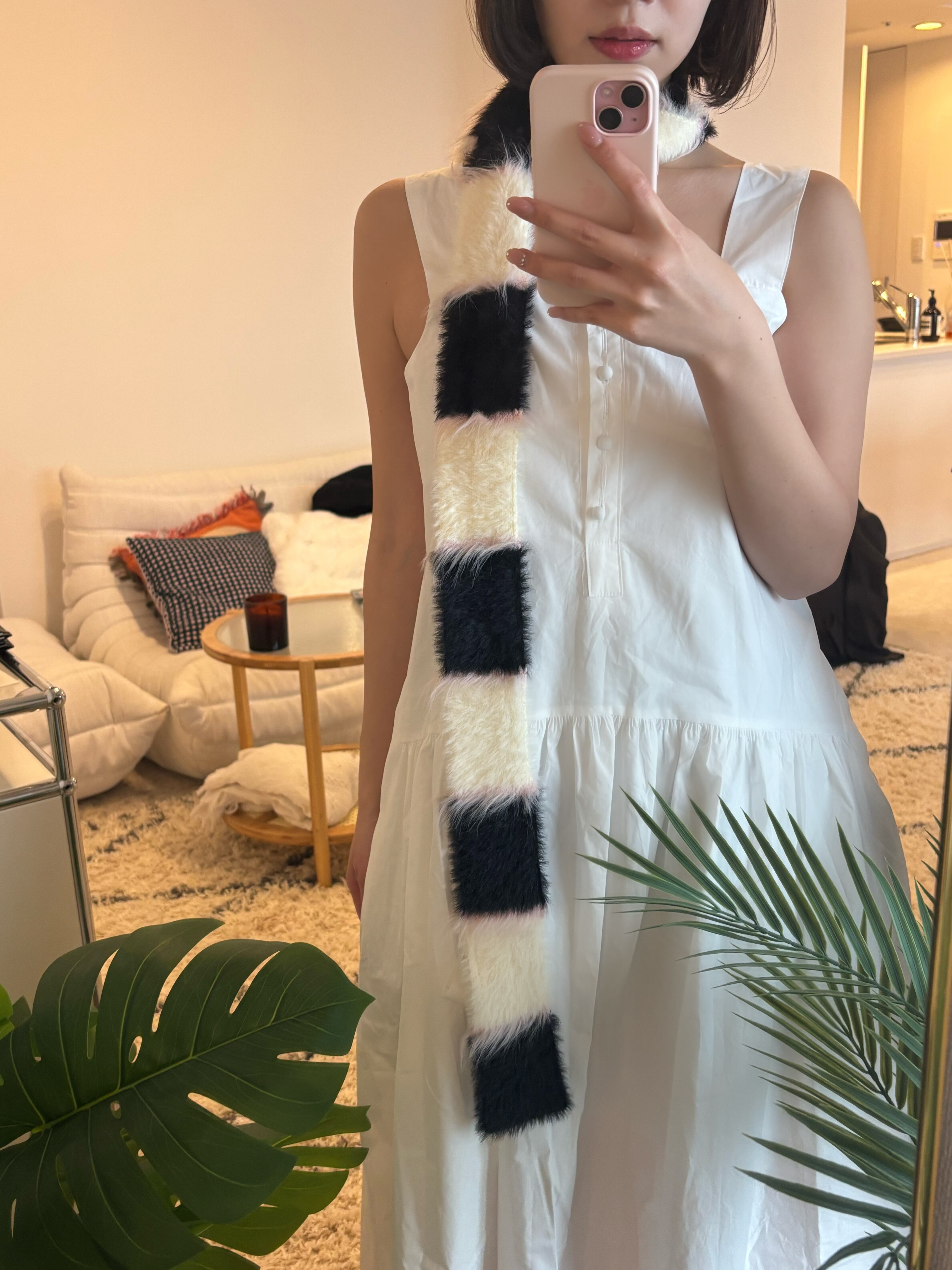 一枚で着ても可愛いですが、シンプルなワンピースのため、デニムや今季トレンドのボーダーのマフラーと合わせてみました。